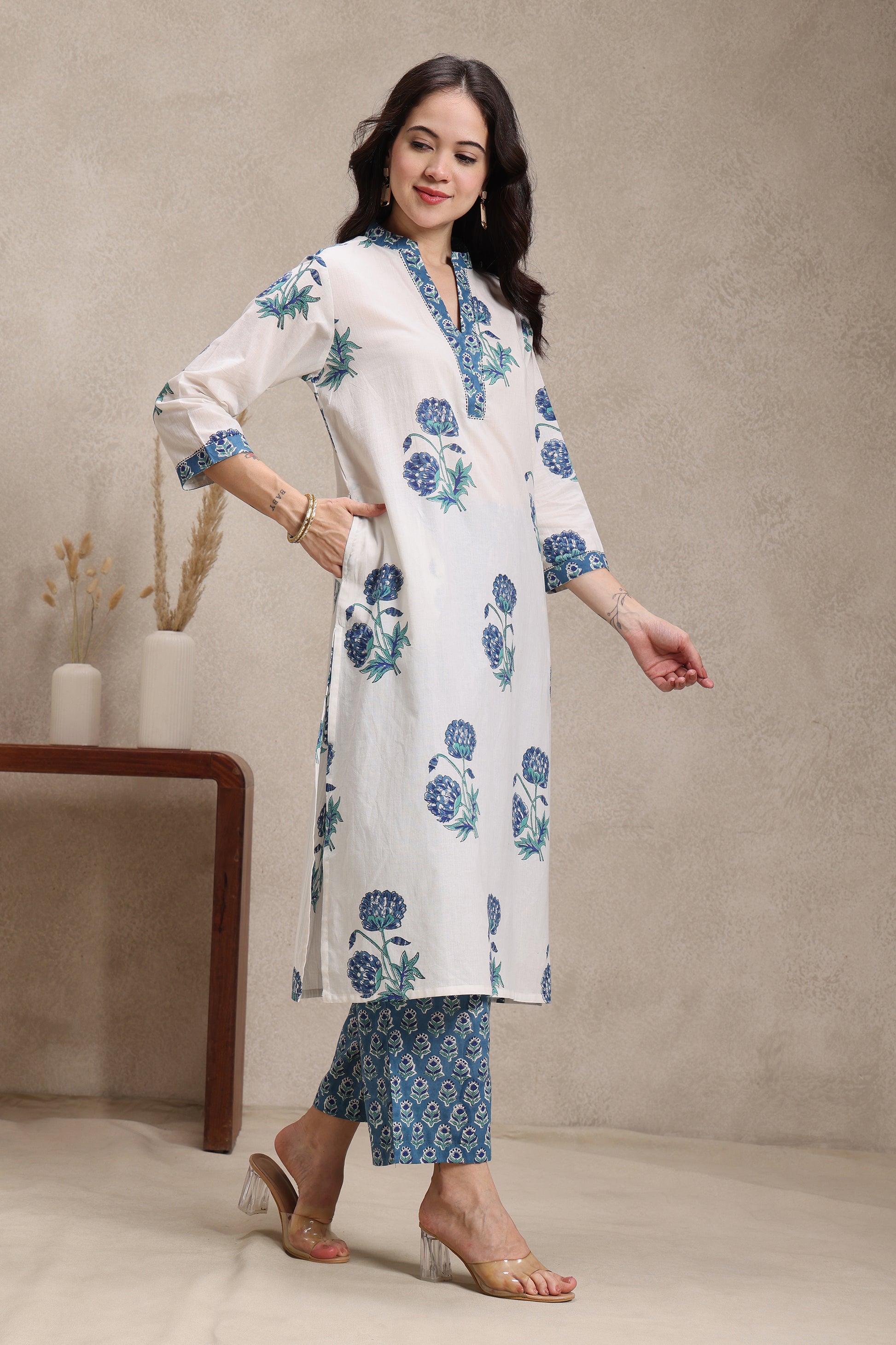 Fresh, breezy, and effortlessly stylish – this indigo blue floral kurta set is your go-to for easy, everyday elegance. The kurta features bold floral block prints and a beautifully printed neckline, paired with coordinated blue printed pants that add a hint of contrast and charm.