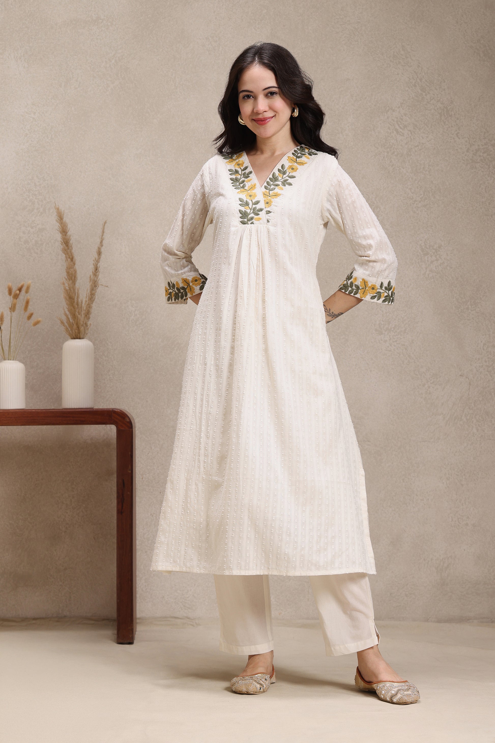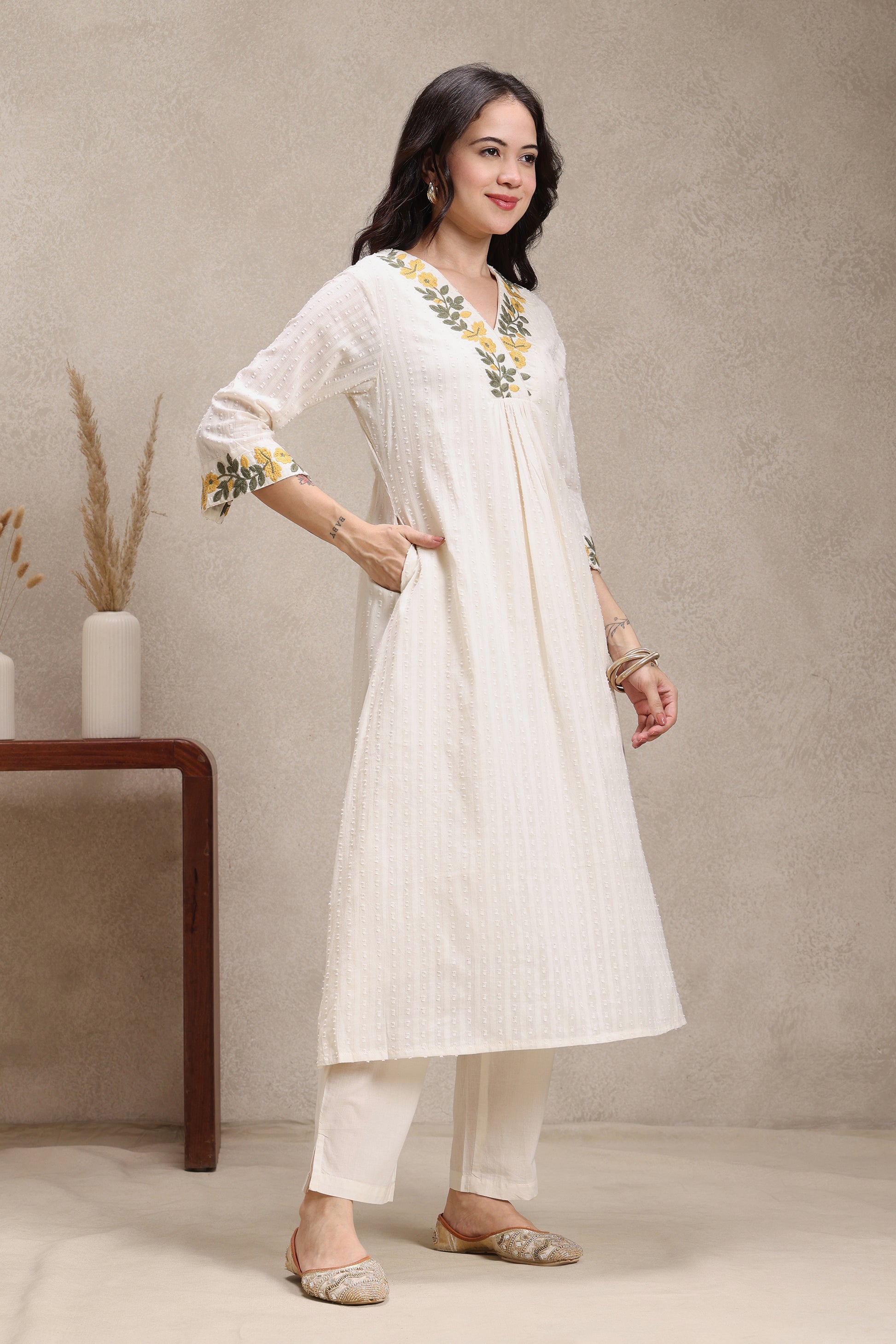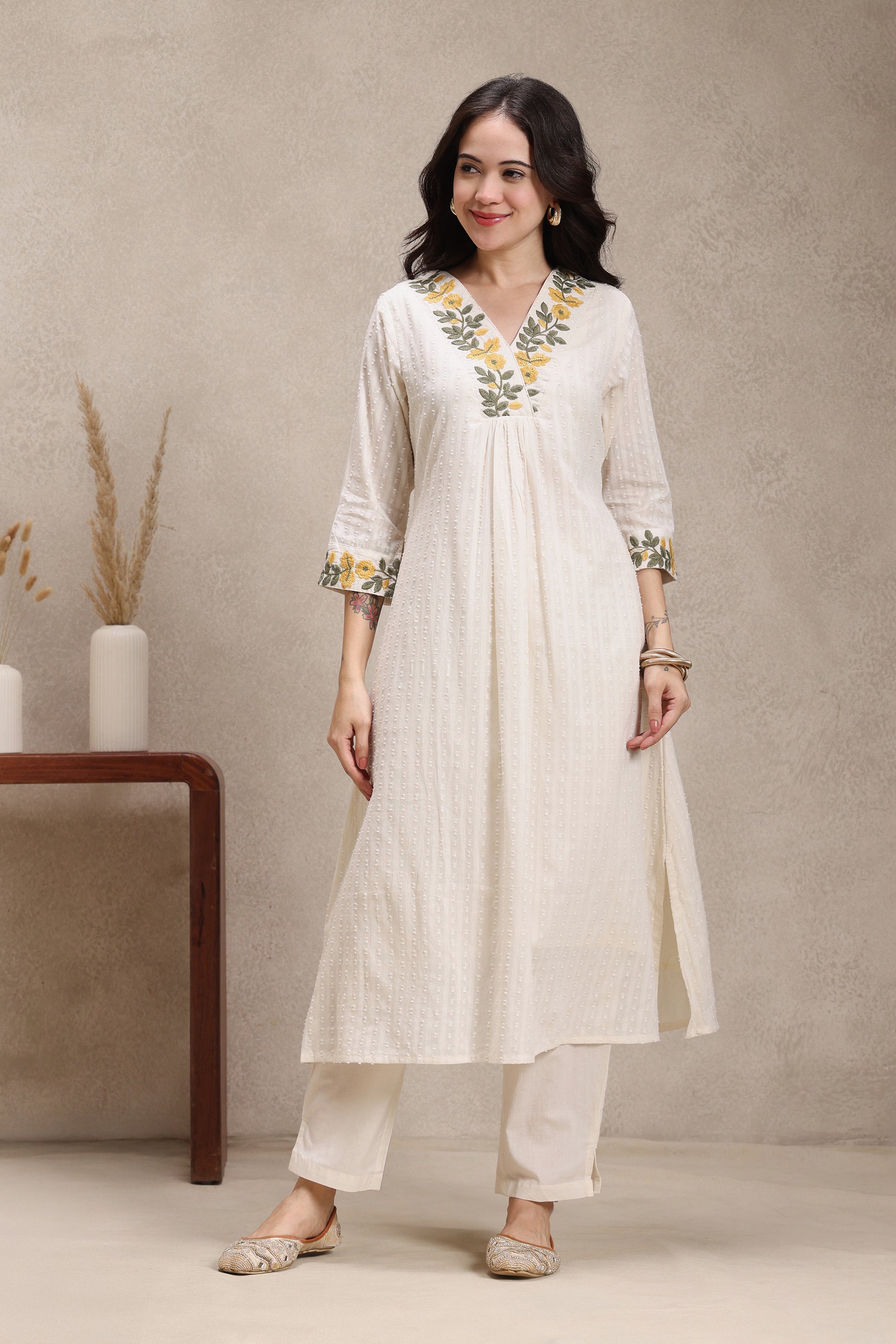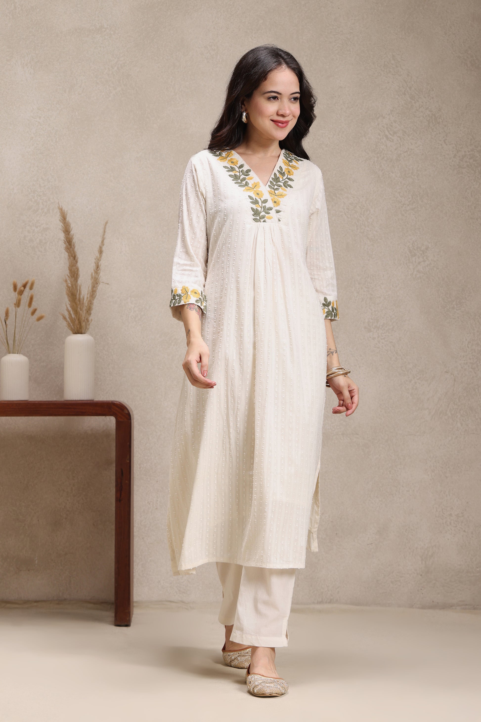 The Maya Set is a classic in comfort and style. Made from breathable cotton, the kurta features delicate embroidery around the neckline and cuffs. The gentle gathers add a soft flow to the silhouette, making it flattering for all-day wear.