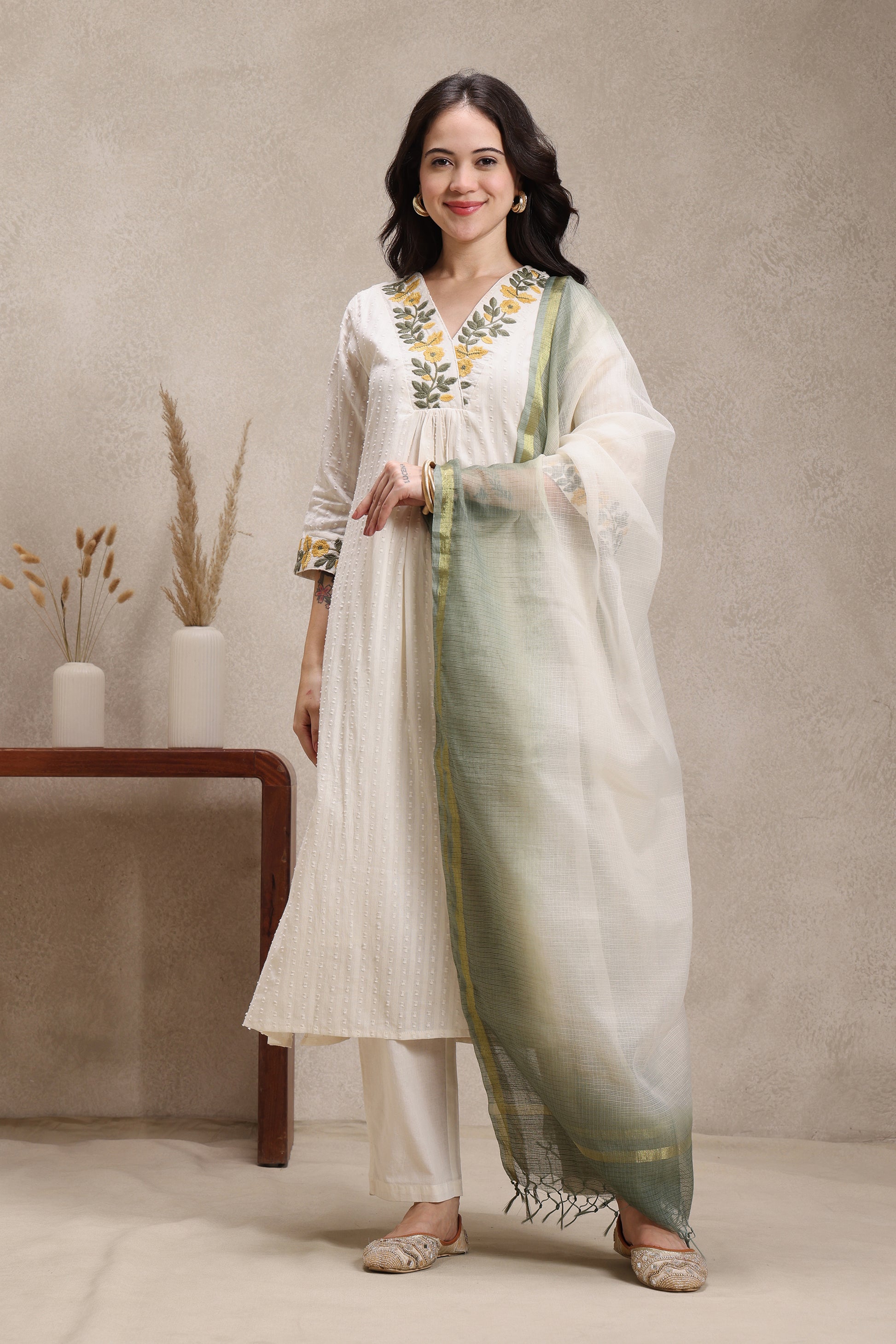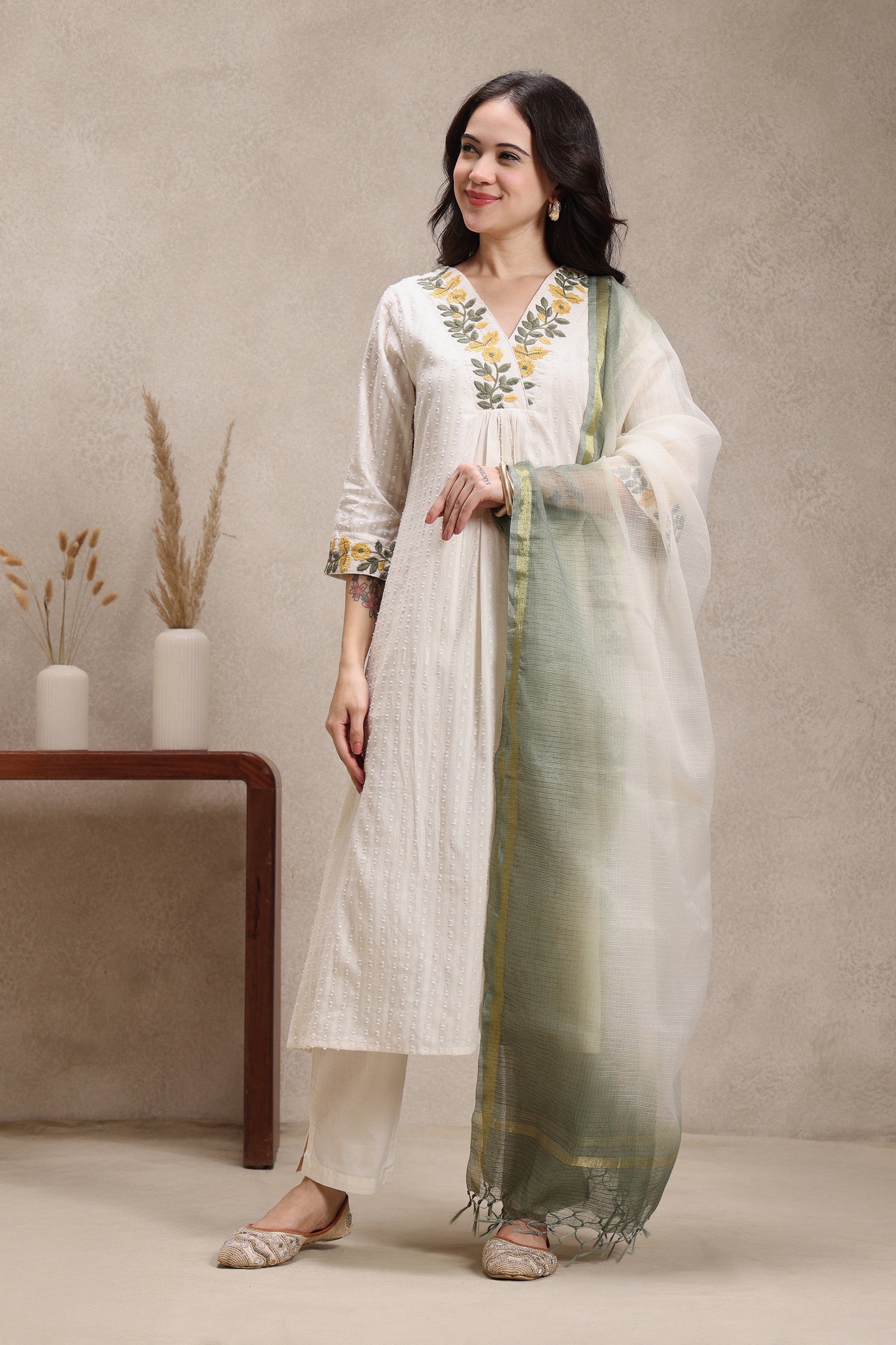 It is paired with straight cotton pants and a lightweight ombré kota dupatta bringing a graceful contrast to the subtle kurta.
