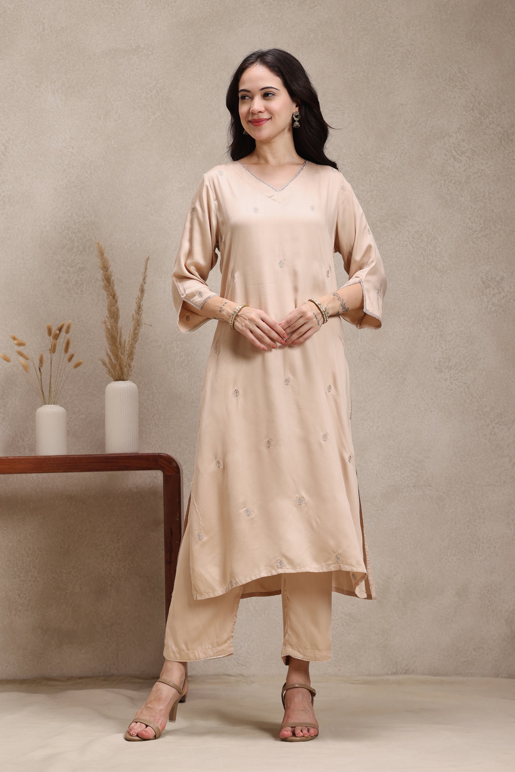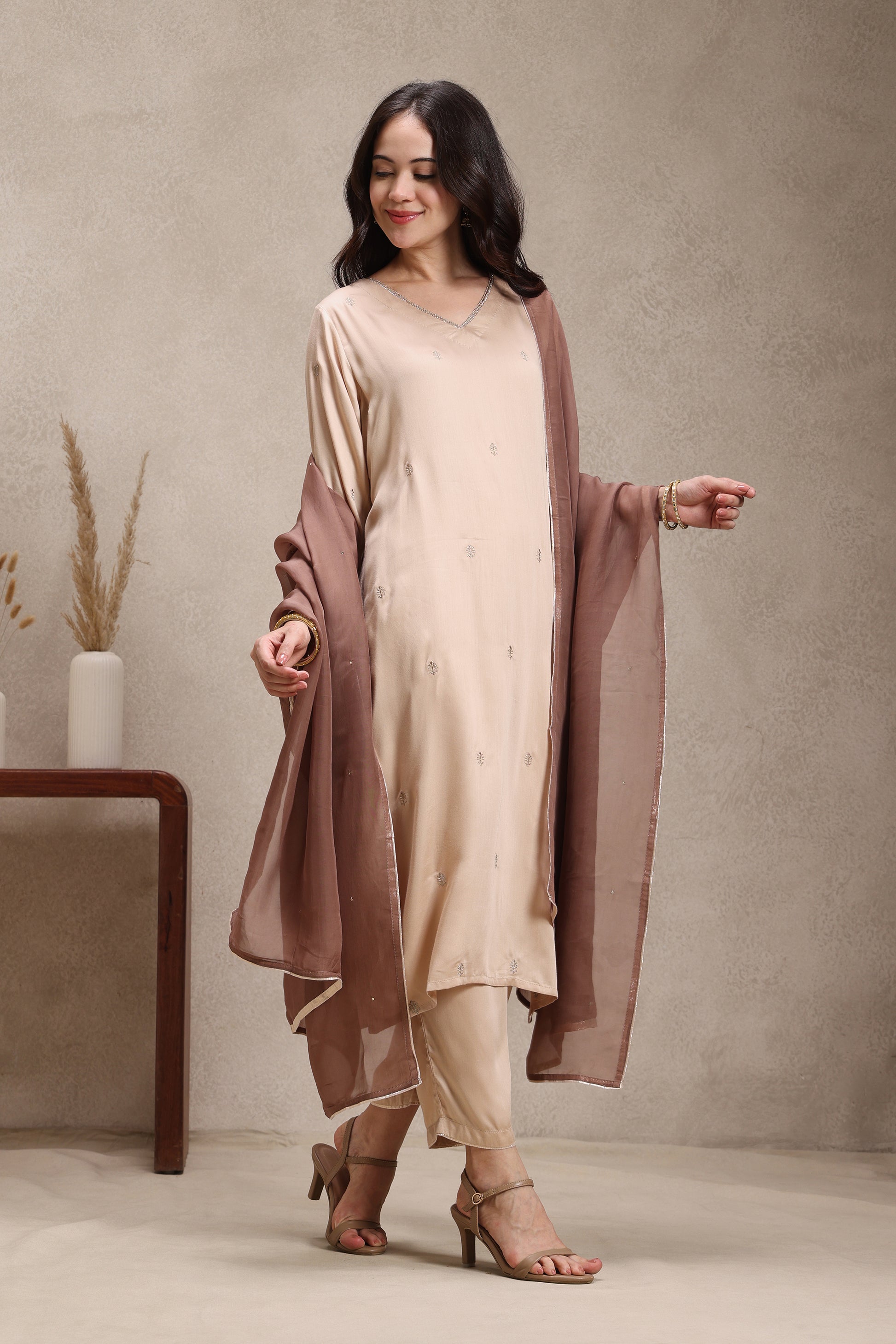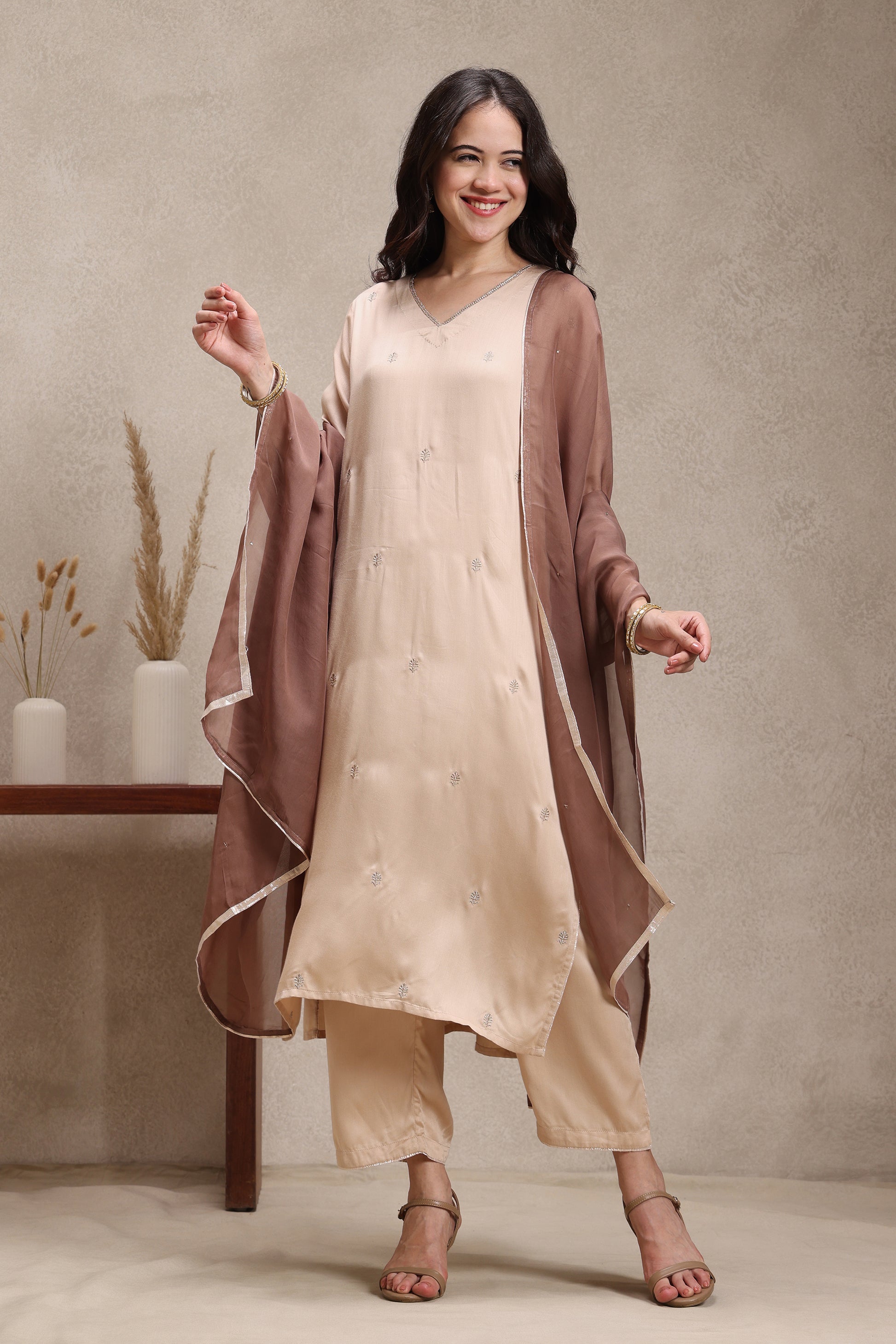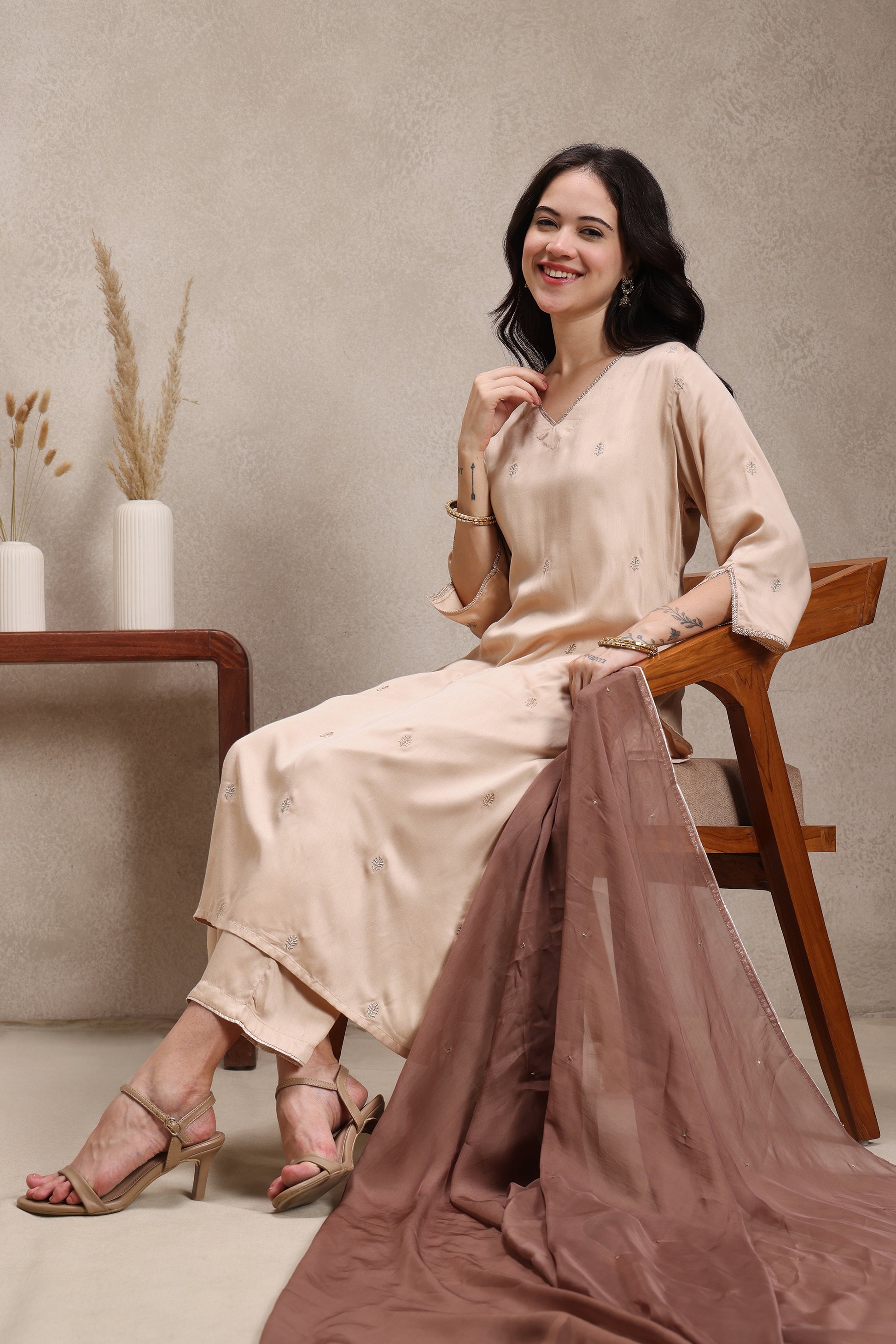 Grace meets minimalism in our Naksh Set. Crafted in a serene hue, this three-piece ensemble features a straight-fit kurta adorned with delicate embroidered butis, paired with tailored pants and a sequined dupatta with subtle zari edges. A timeless outfit that flows effortlessly from festive gatherings to evening soirées. Perfect for festive wear, family get-togethers & special occasions✨