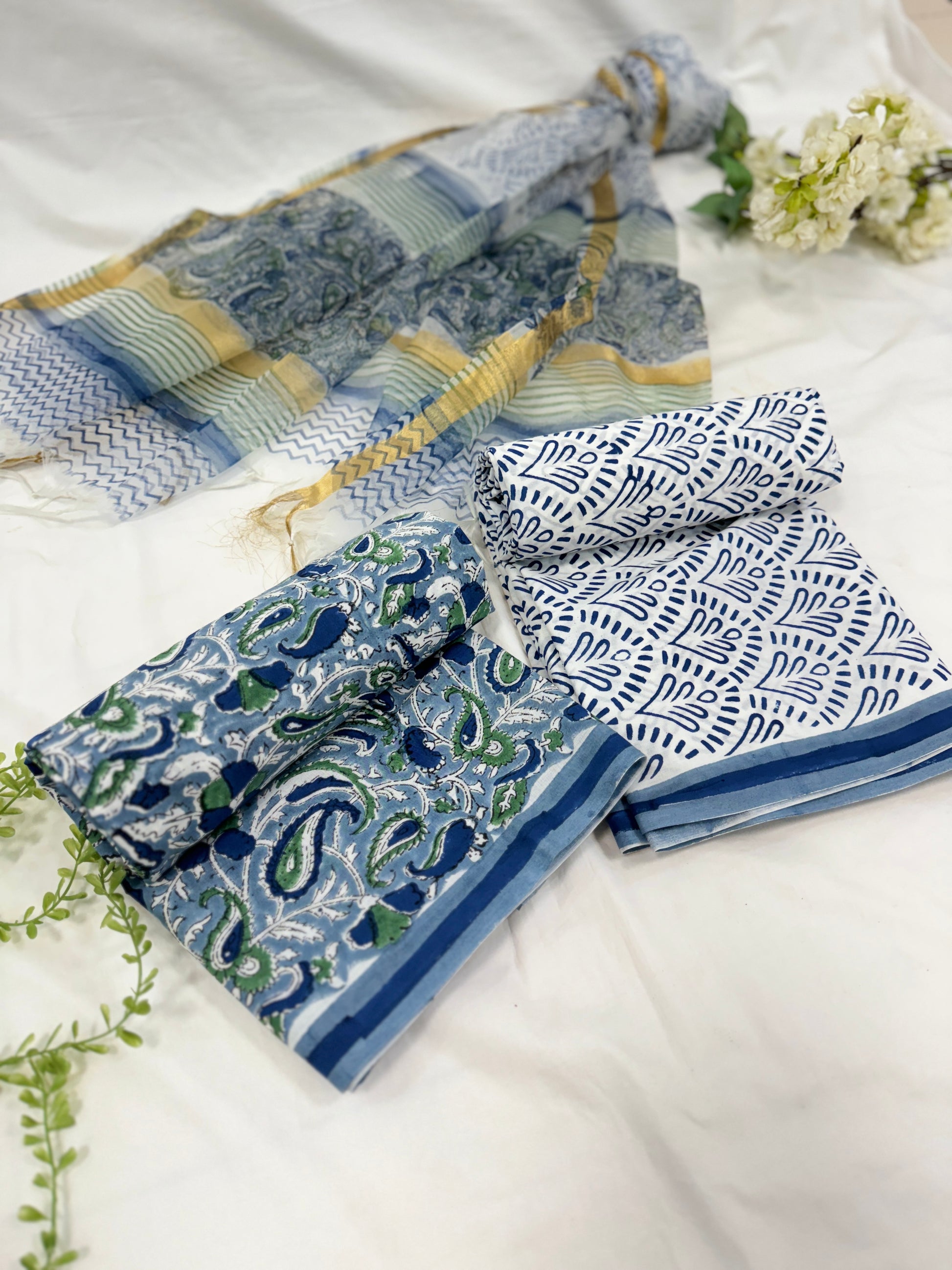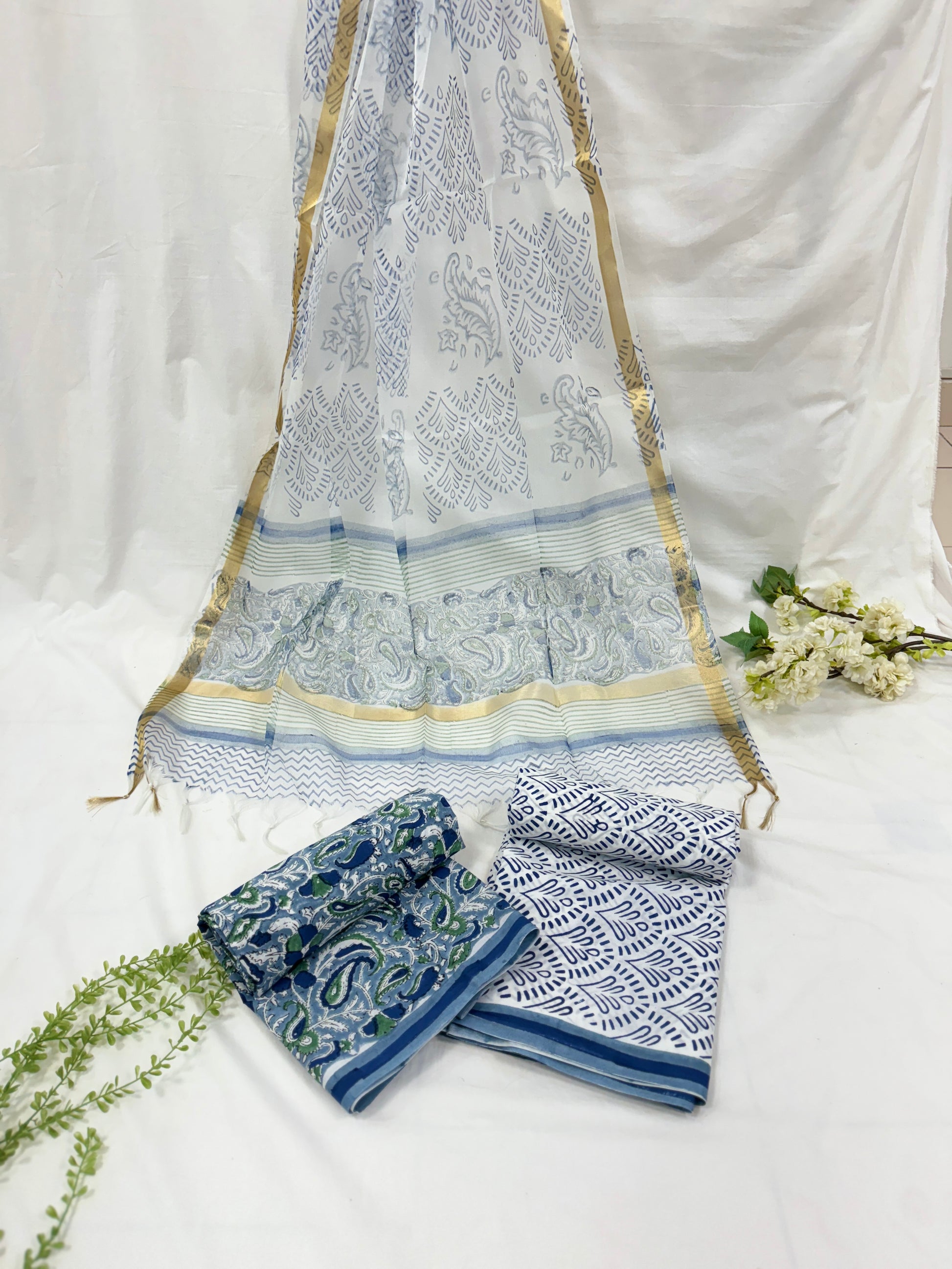 Elevate your wardrobe with our exquisite hand block printed cotton suit set with Kota doriya /Organza dupatta, featuring intricate traditional designs that reflect the rich cultural heritage of India. This set includes a beautifully printed kurta fabric, a matching dupatta, and complementing bottom fabric, perfect for crafting a stunning ethnic ensemble.