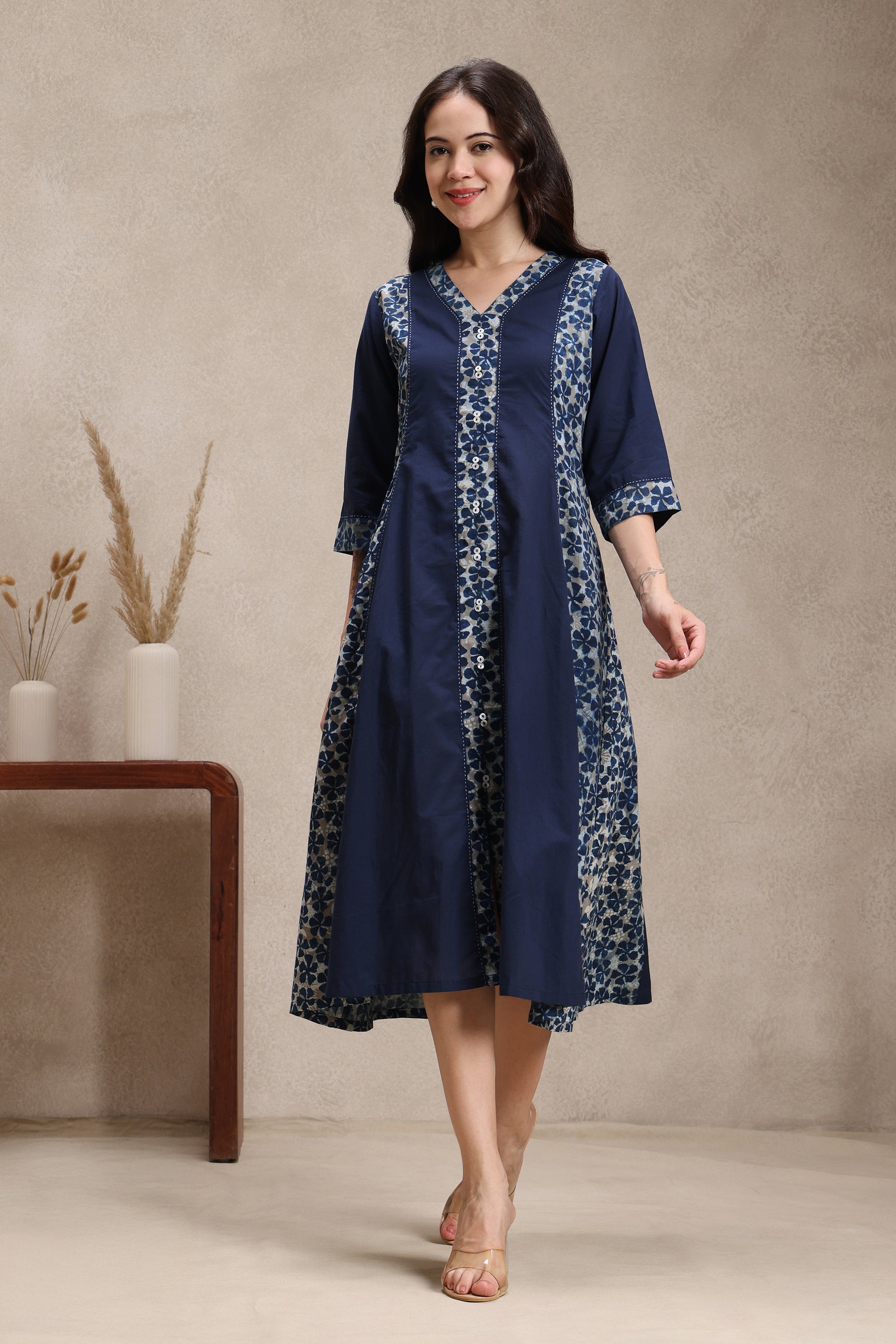 The subtle hand-block prints on the side panels beautifully contrast with the solid body, while the V-neckline, 3/4th sleeves, and midi length make it an effortless choice for everyday elegance or casual gatherings. The front button-down detailing completes its versatile look.