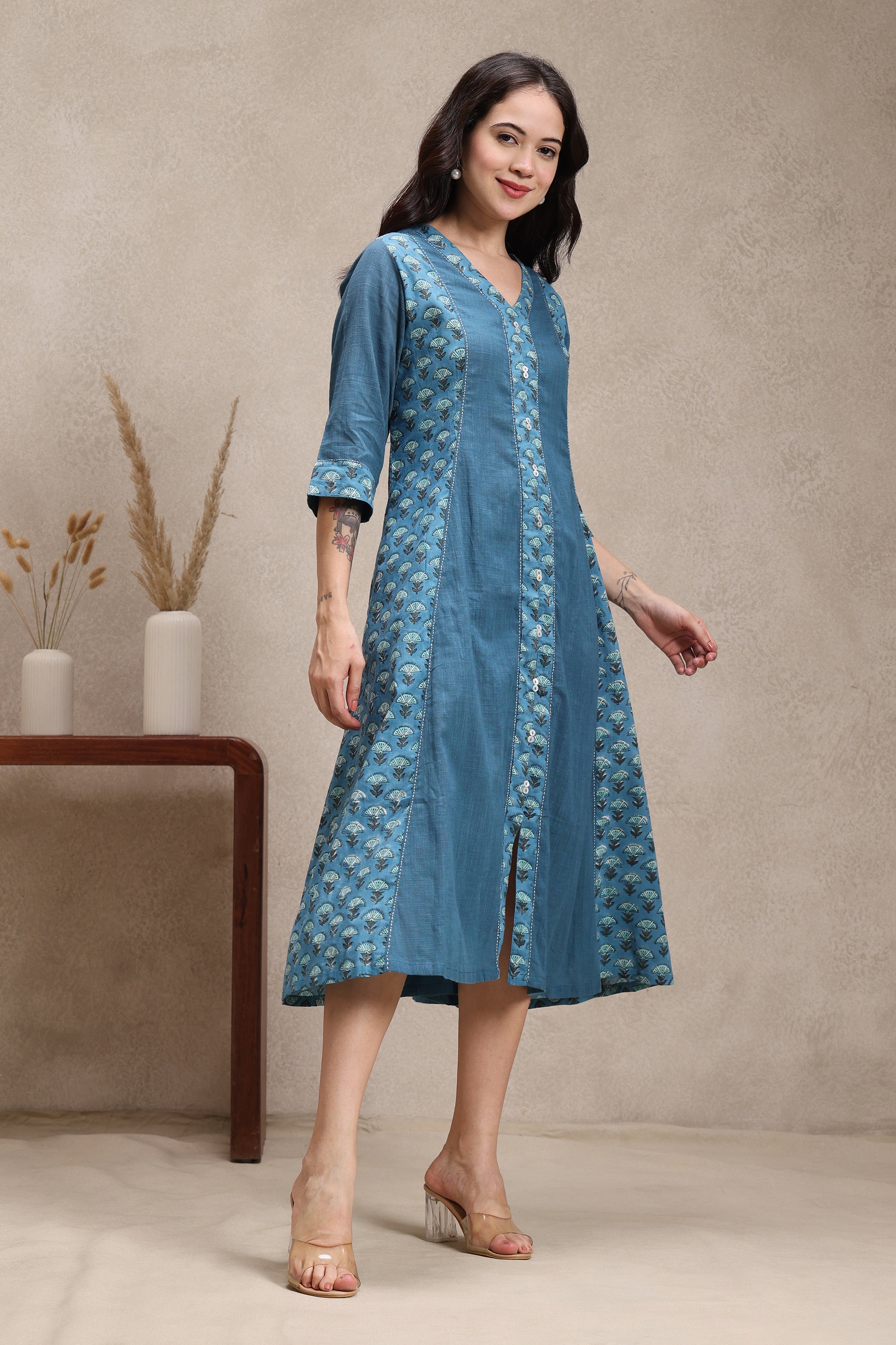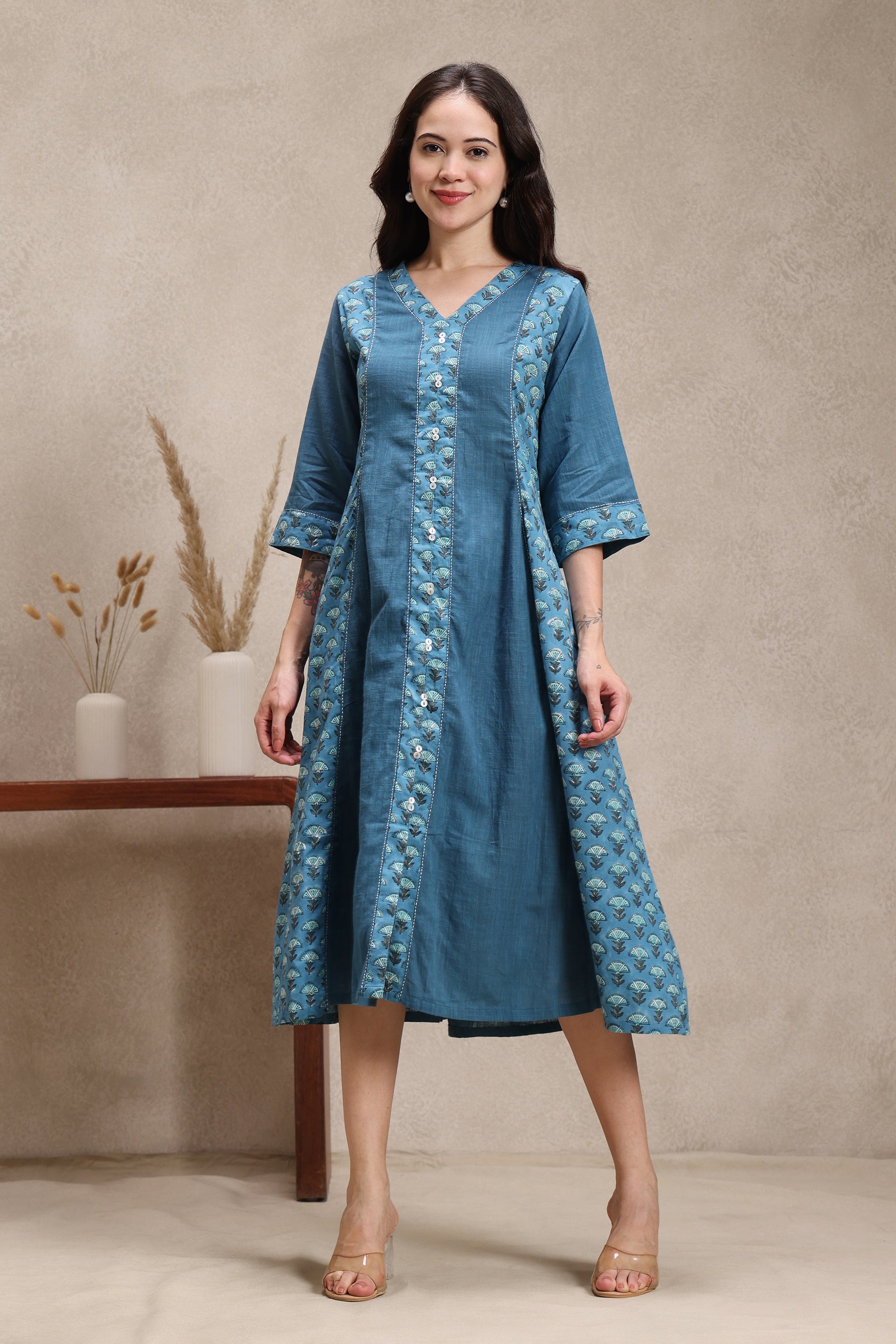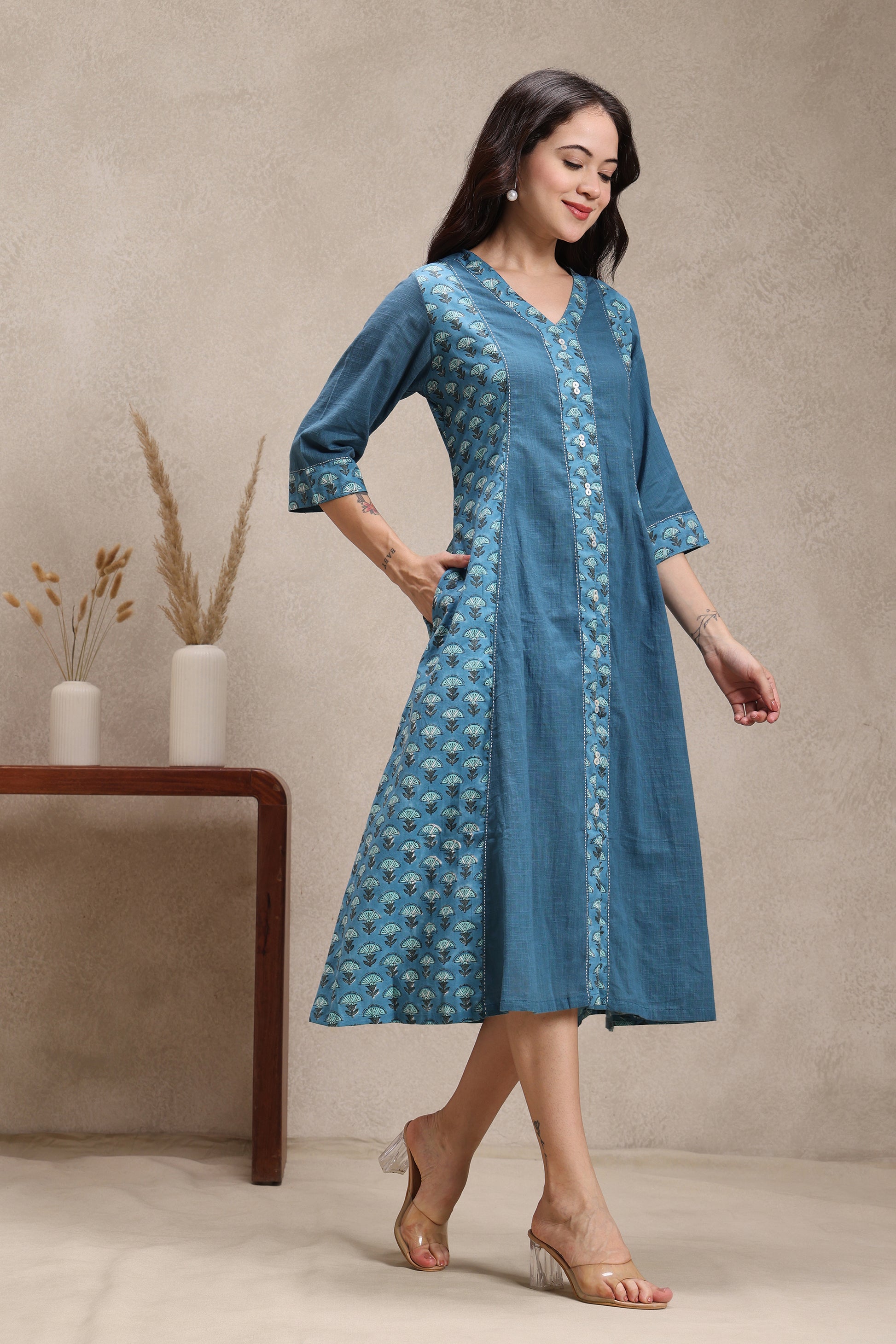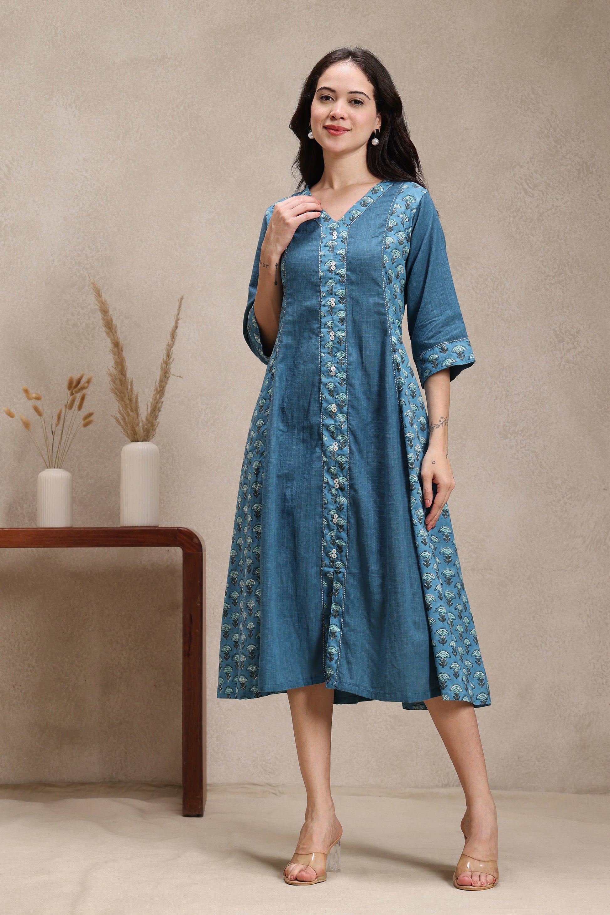 The subtle hand-block prints on the side panels beautifully contrast with the solid body, while the V-neckline, 3/4th sleeves, and midi length make it an effortless choice for everyday elegance or casual gatherings. The front button-down detailing completes its versatile look.