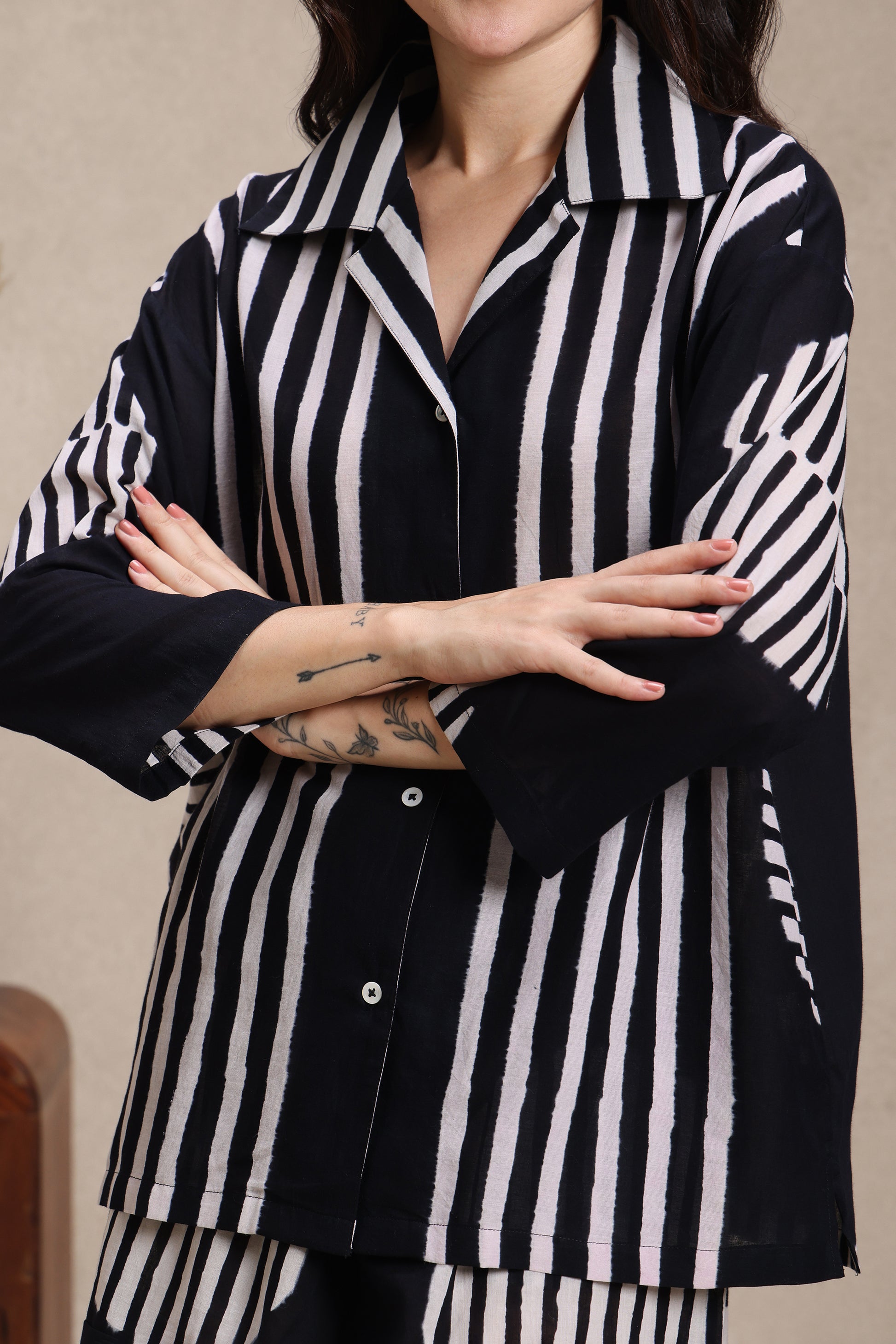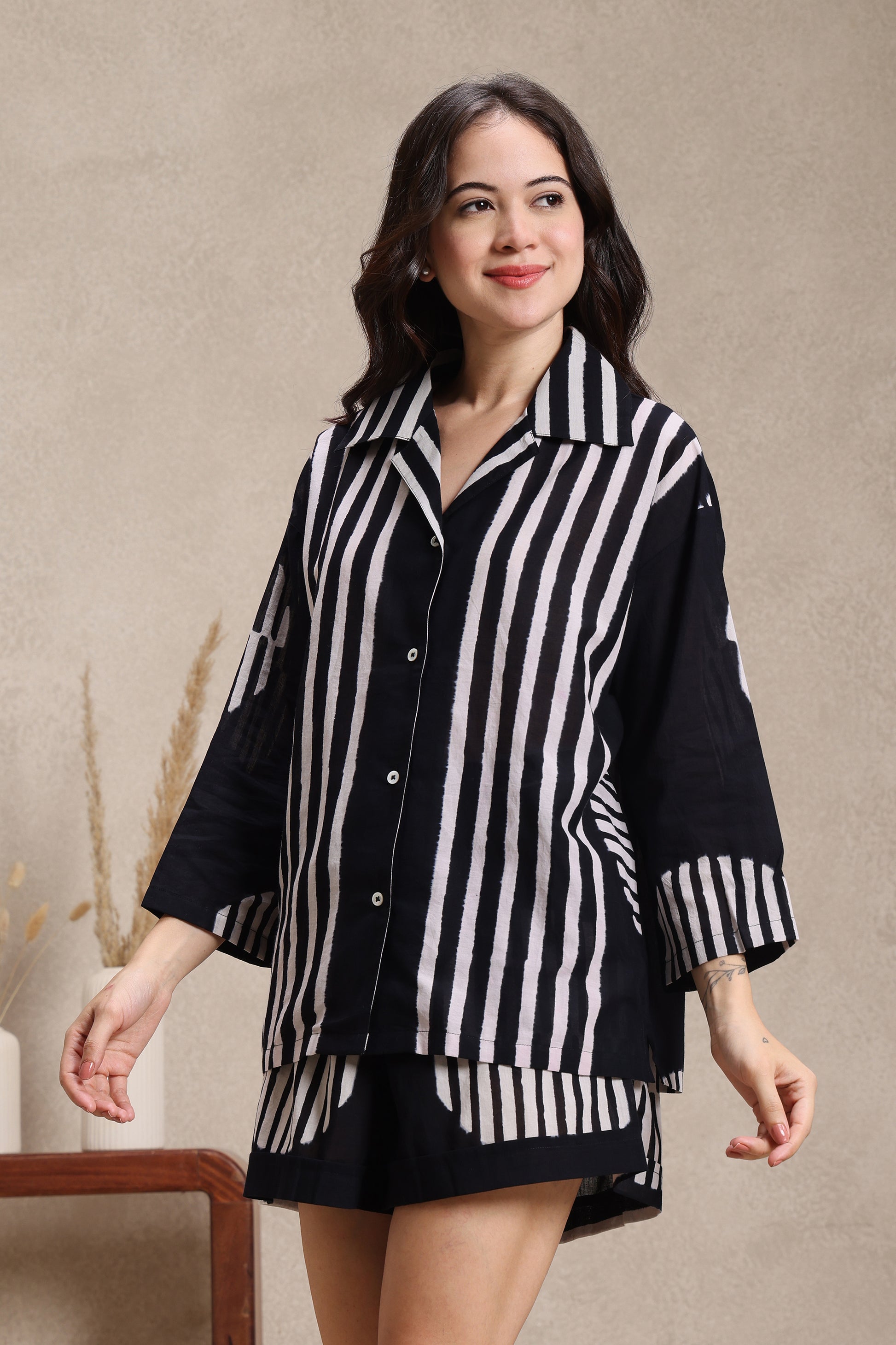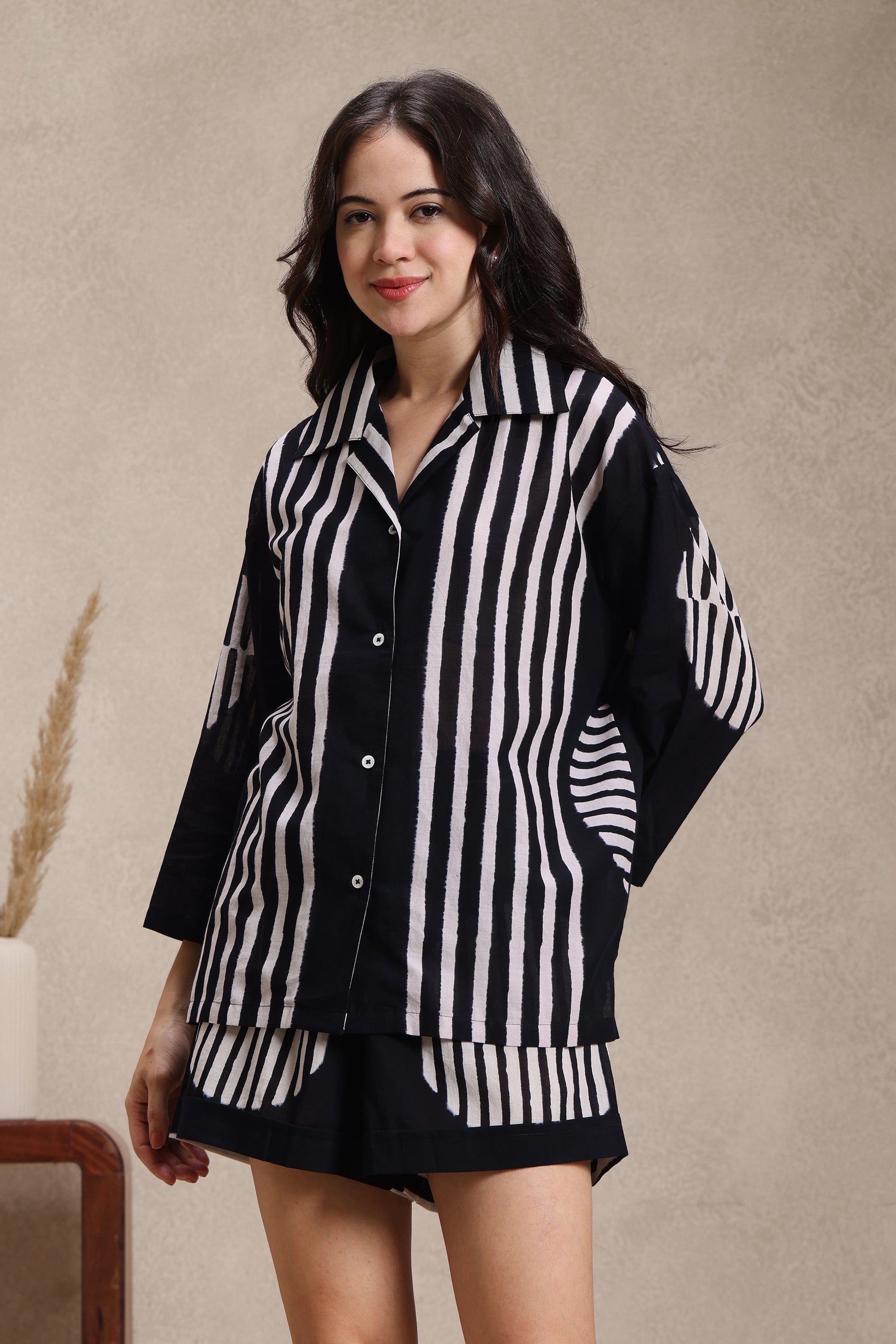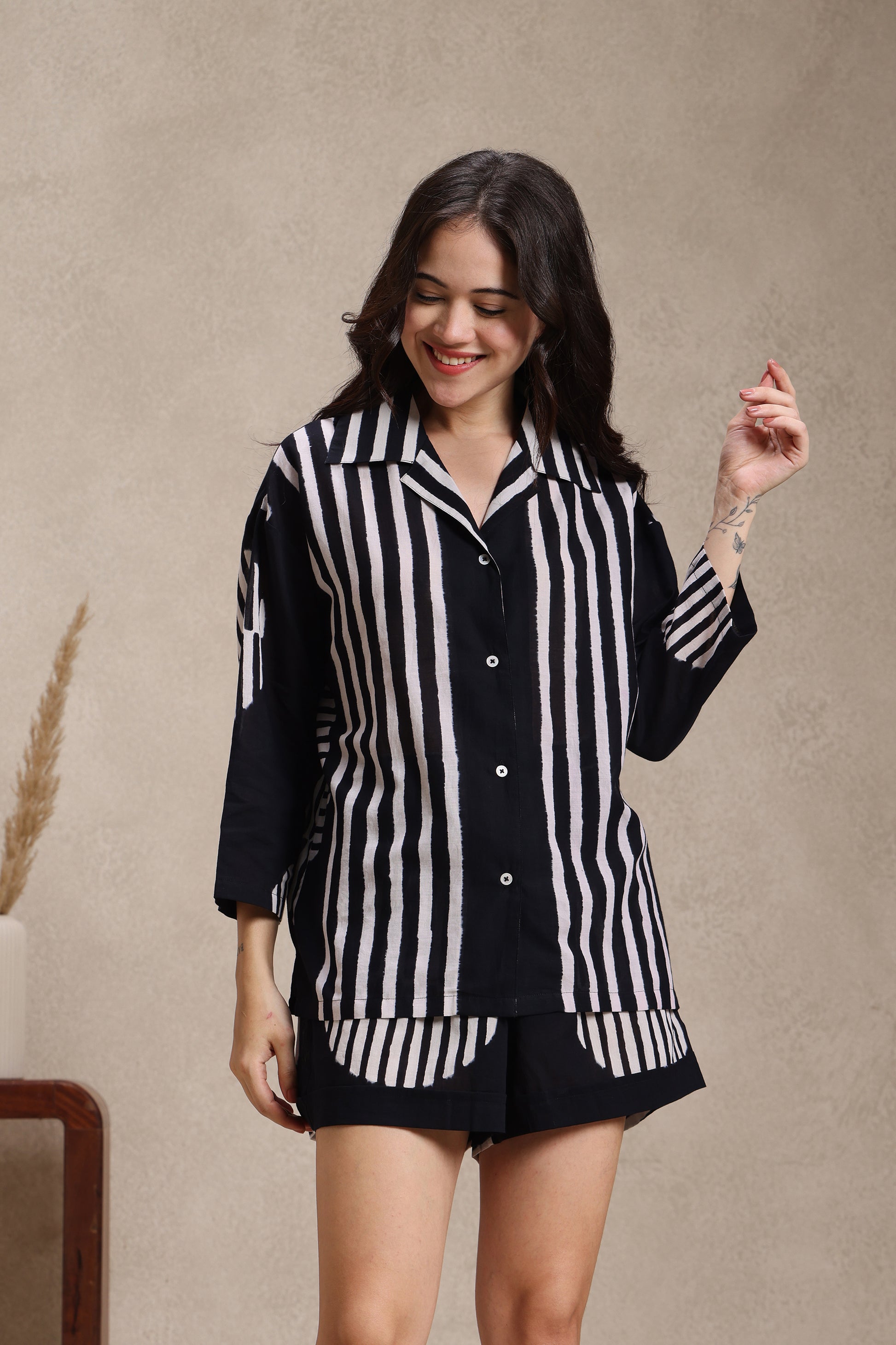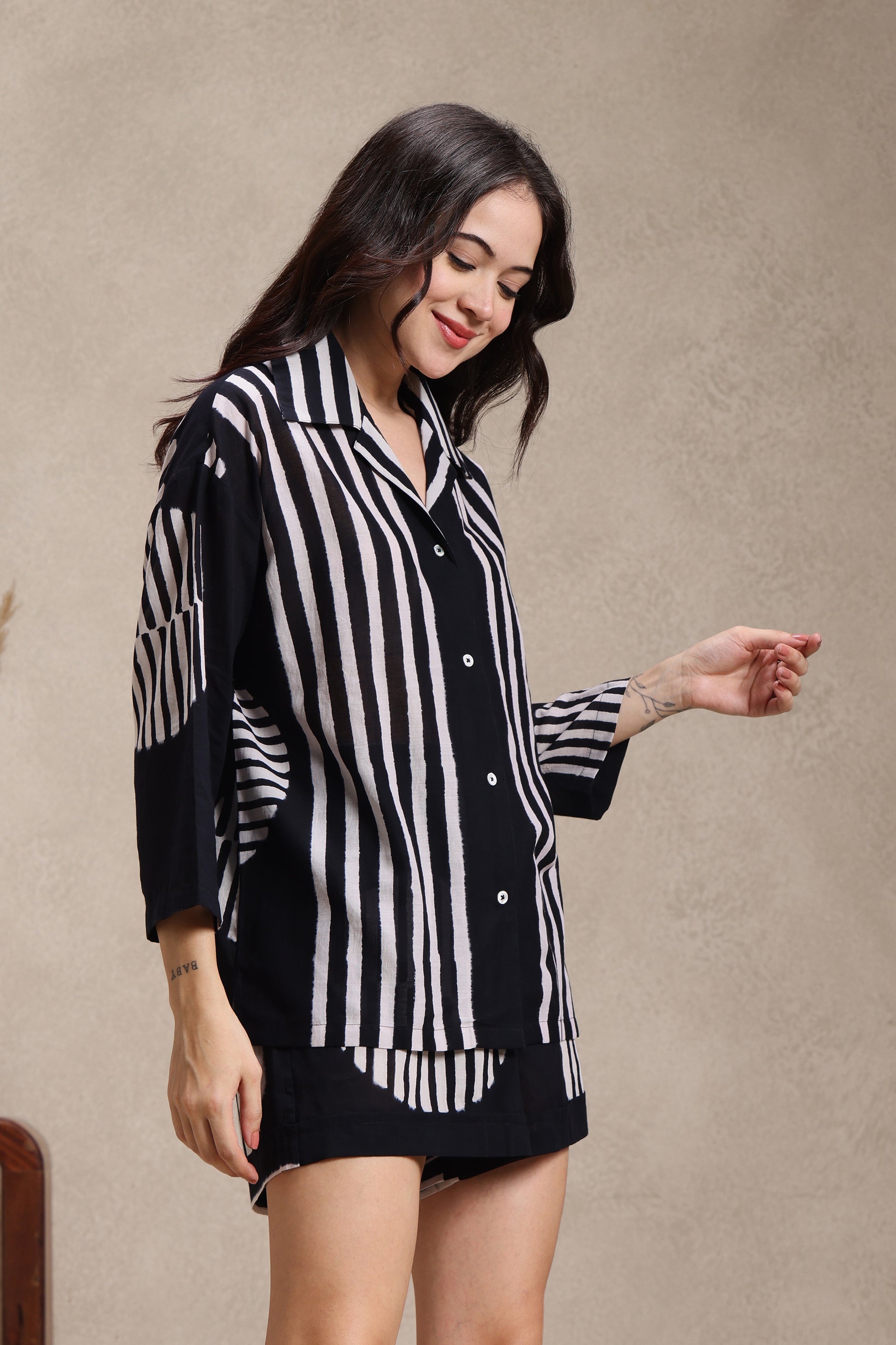 The set features a relaxed button-down shirt with a classic collar and straight cut, paired with drawstring shorts for that perfect laid-back fit. The striking black and white striped print adds a modern, artsy edge to your downtime wardrobe.