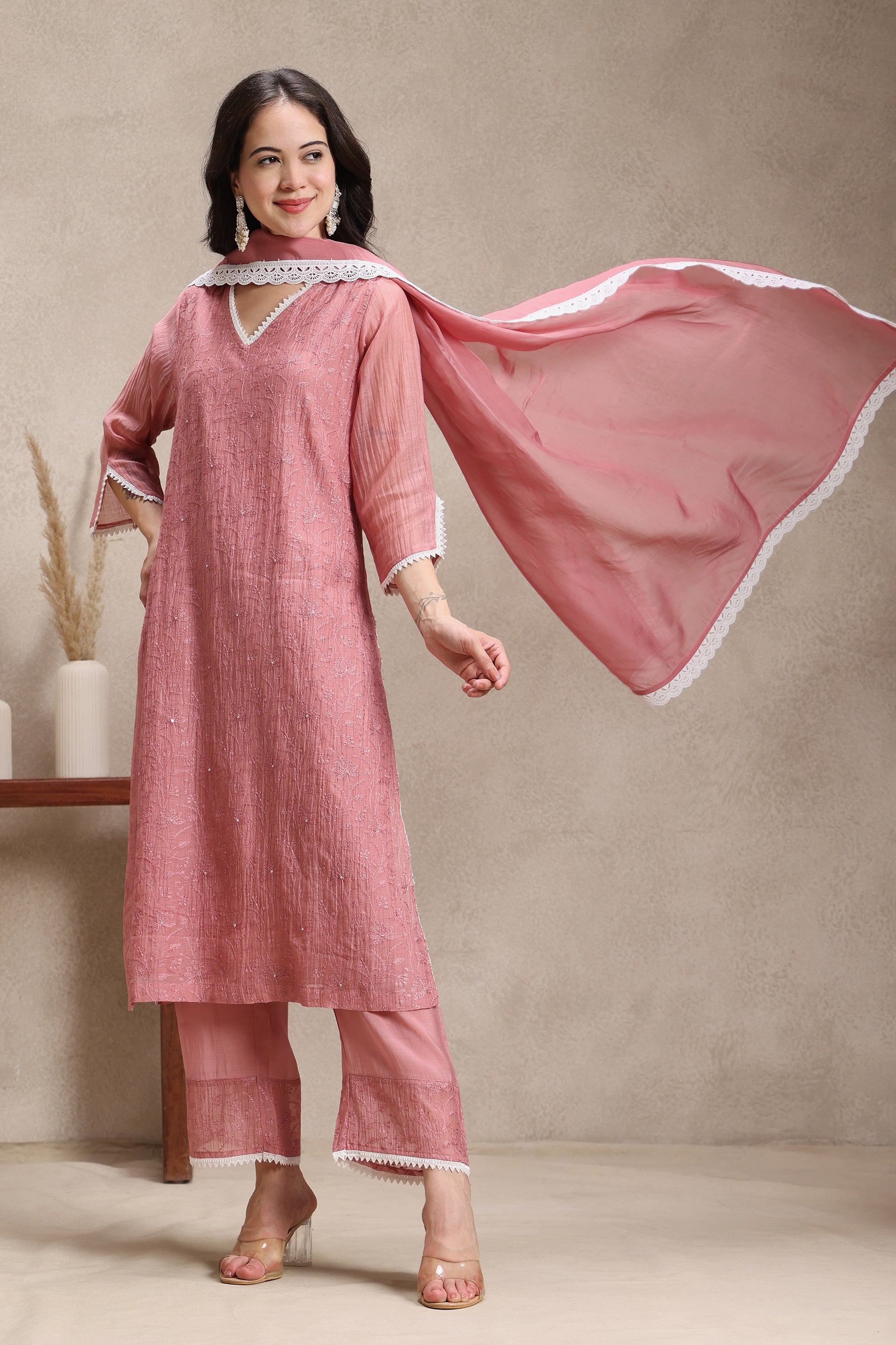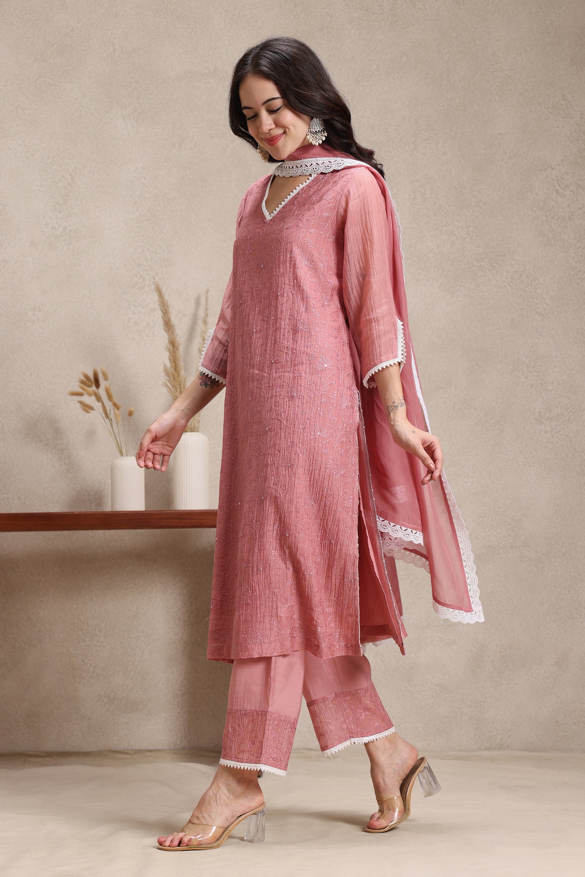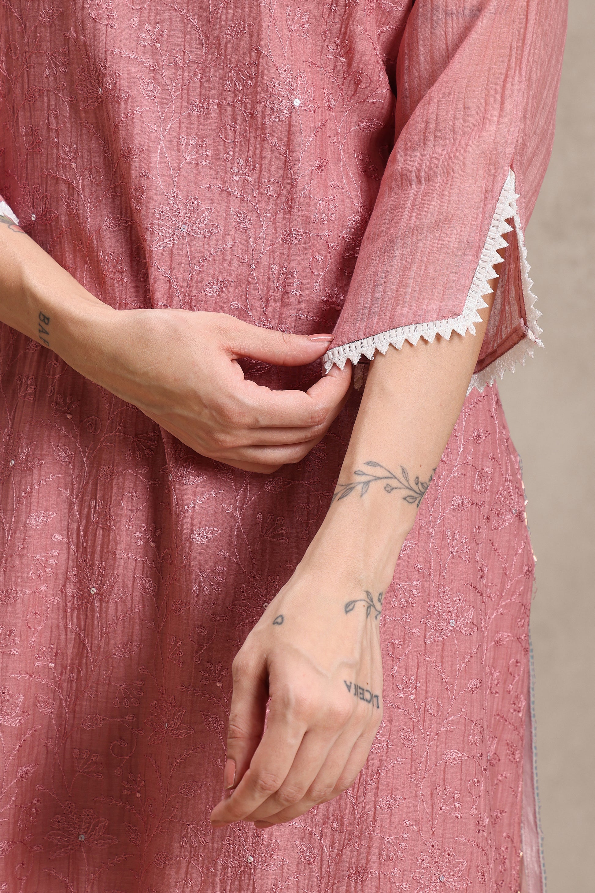 Soft, dreamy, and oh-so-elegant — The Sukoon Set is everything your wardrobe has been waiting for. Made in lightweight mul chanderi, it drapes beautifully and keeps you comfortable all day. The kurta comes with delicate self-embroidery and a graceful neckline. Paired with straight-fit trousers showcasing embroidered hems, and a flowy dupatta, edged with lace that adds just the right amount of charm to the look.