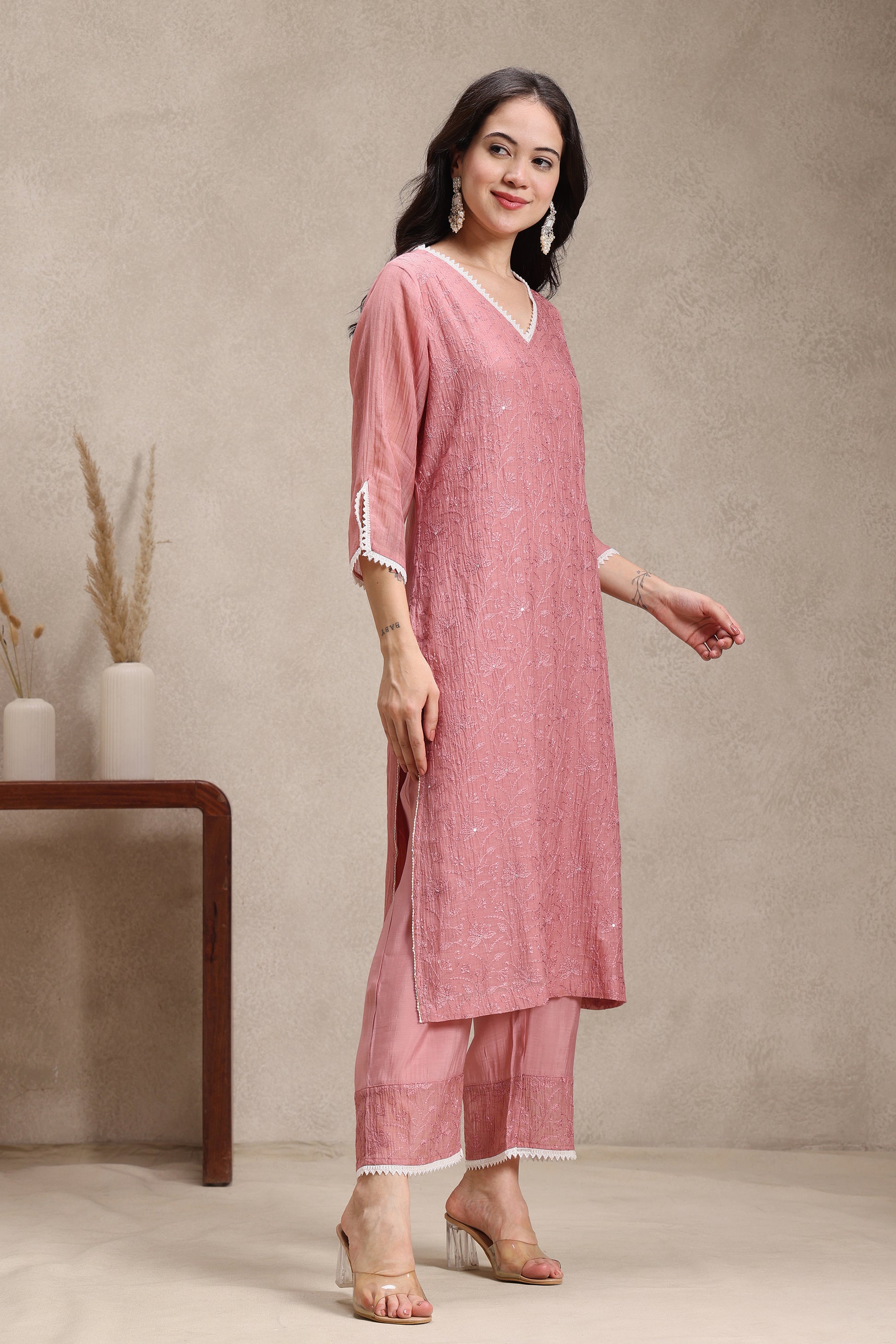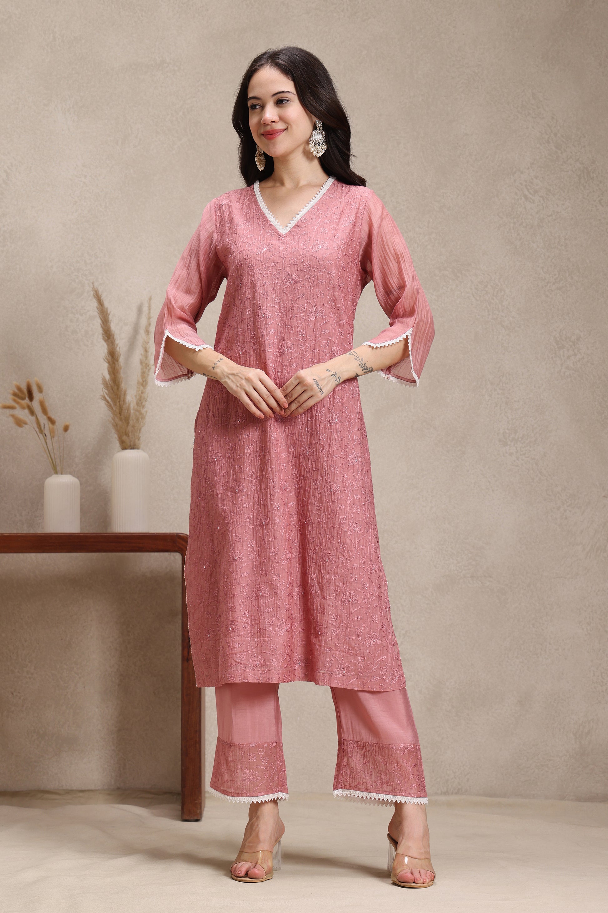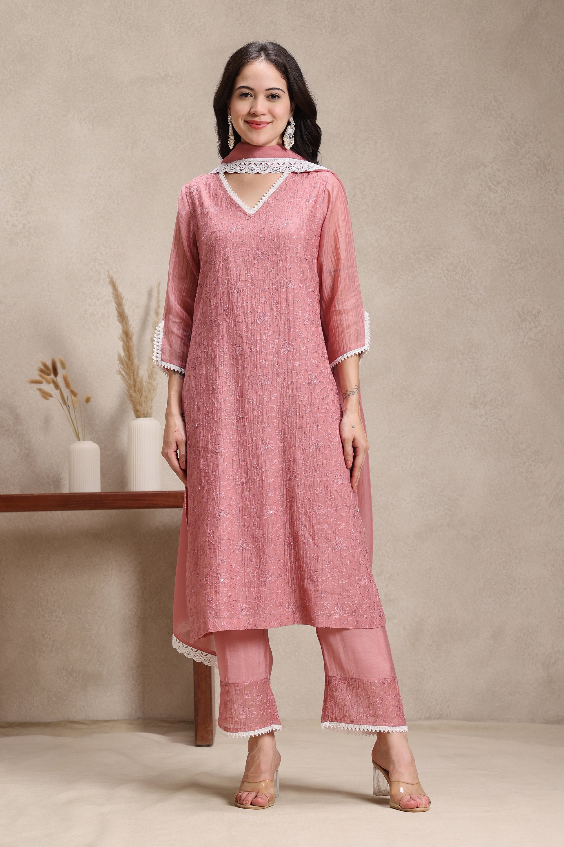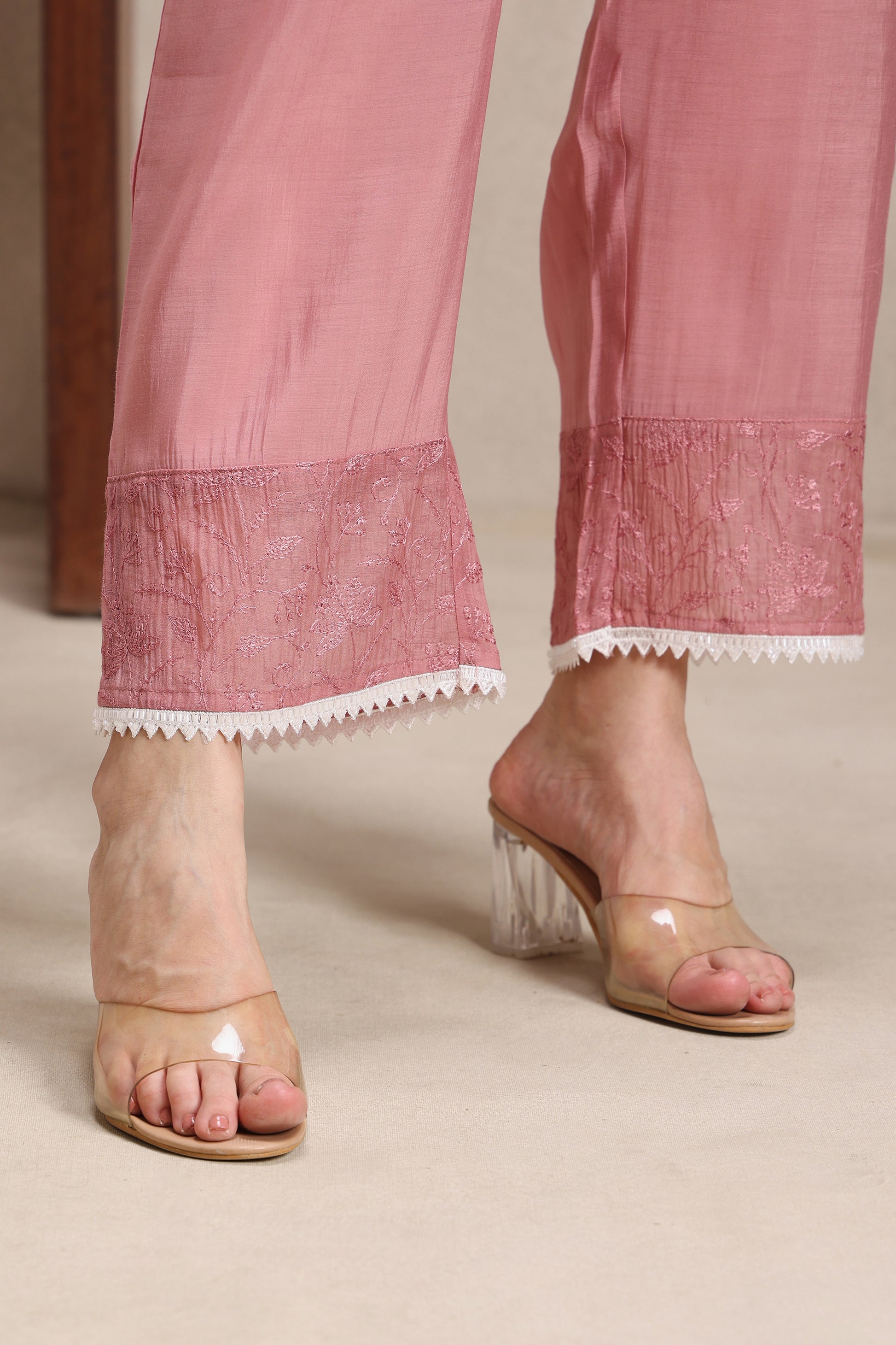Soft, dreamy, and oh-so-elegant — The Sukoon Set is everything your wardrobe has been waiting for. Made in lightweight mul chanderi, it drapes beautifully and keeps you comfortable all day. The kurta comes with delicate self-embroidery and a graceful neckline. Paired with straight-fit trousers showcasing embroidered hems, and a flowy dupatta, edged with lace that adds just the right amount of charm to the look.