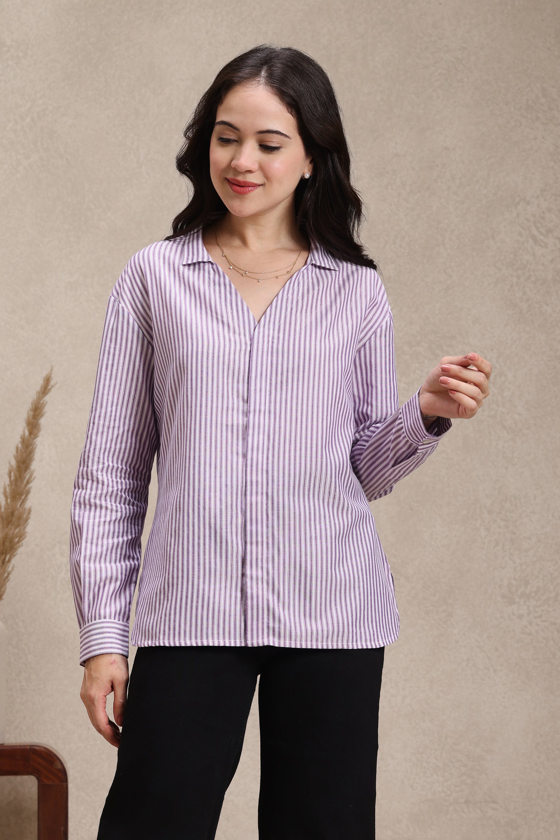 Where classic tailoring meets a touch of shimmer, Giva shirt is made in breathable cotton lurex. The fabric features woven stripes with a subtle metallic sheen that catches the light beautifully without being overpowering. It's structured yet relaxed fit makes it versatile enough to style for work, brunches, or casual evenings.
